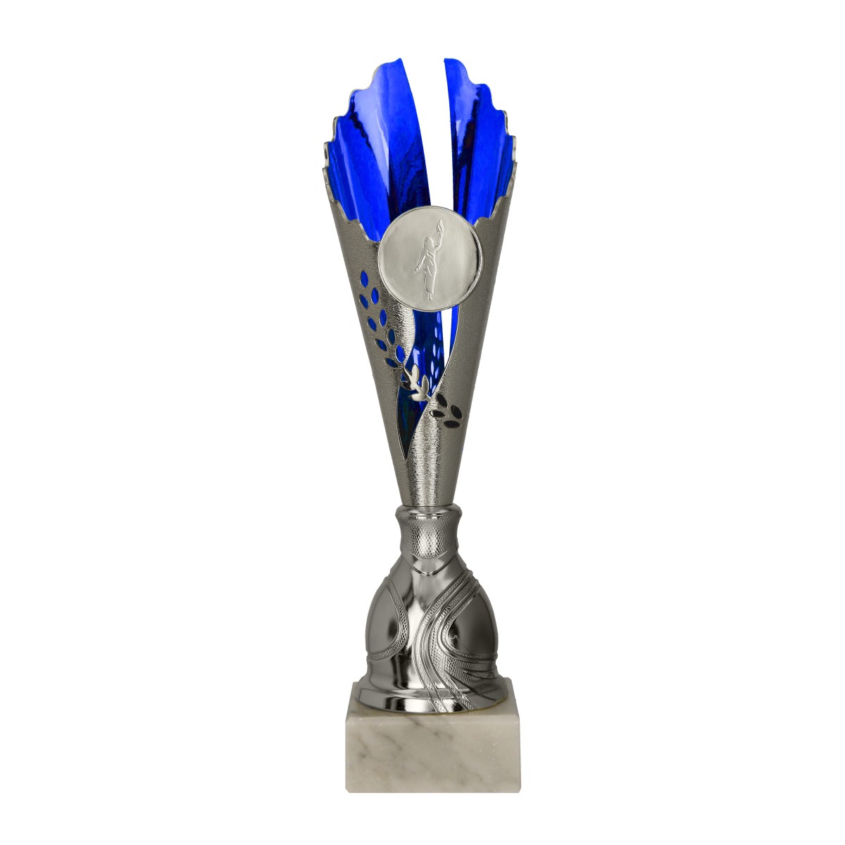 Plastikowy srebrno-niebieski puchar 7245, ciekawy ażurowy kielich z miejscem na emblemat 50 mm, ustawiony na eleganckiej stopce. Całość umocowana jest na marmurowym postumencie.